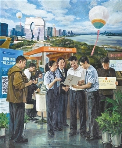 油畫《浙江省三個(gè)“一號(hào)工程”——改革攻堅(jiān)》,浙江省油畫院集體創(chuàng)作。