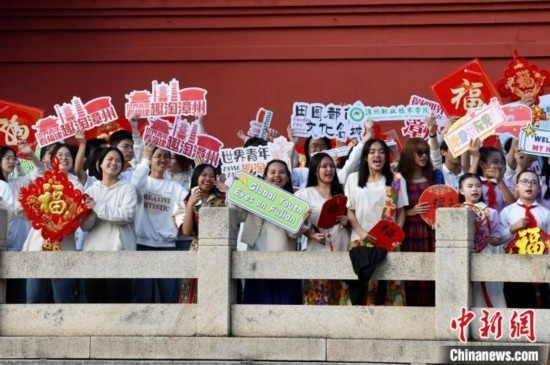 圖為中外青年揮舞手中的中國結(jié)、“?!弊?、手牌等,表達此行的歡樂和美好。中新社記者 王東明 攝