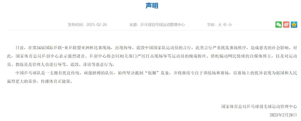 國家體育總局乒乓球羽毛球運(yùn)動(dòng)管理中心26日發(fā)布聲明,強(qiáng)烈譴責(zé)嚴(yán)重?cái)_亂第34屆國際乒聯(lián)-亞乒聯(lián)盟亞洲杯賽場秩序、造成惡劣社會影響的行為,并將會同相關(guān)部門進(jìn)行嚴(yán)厲打擊。