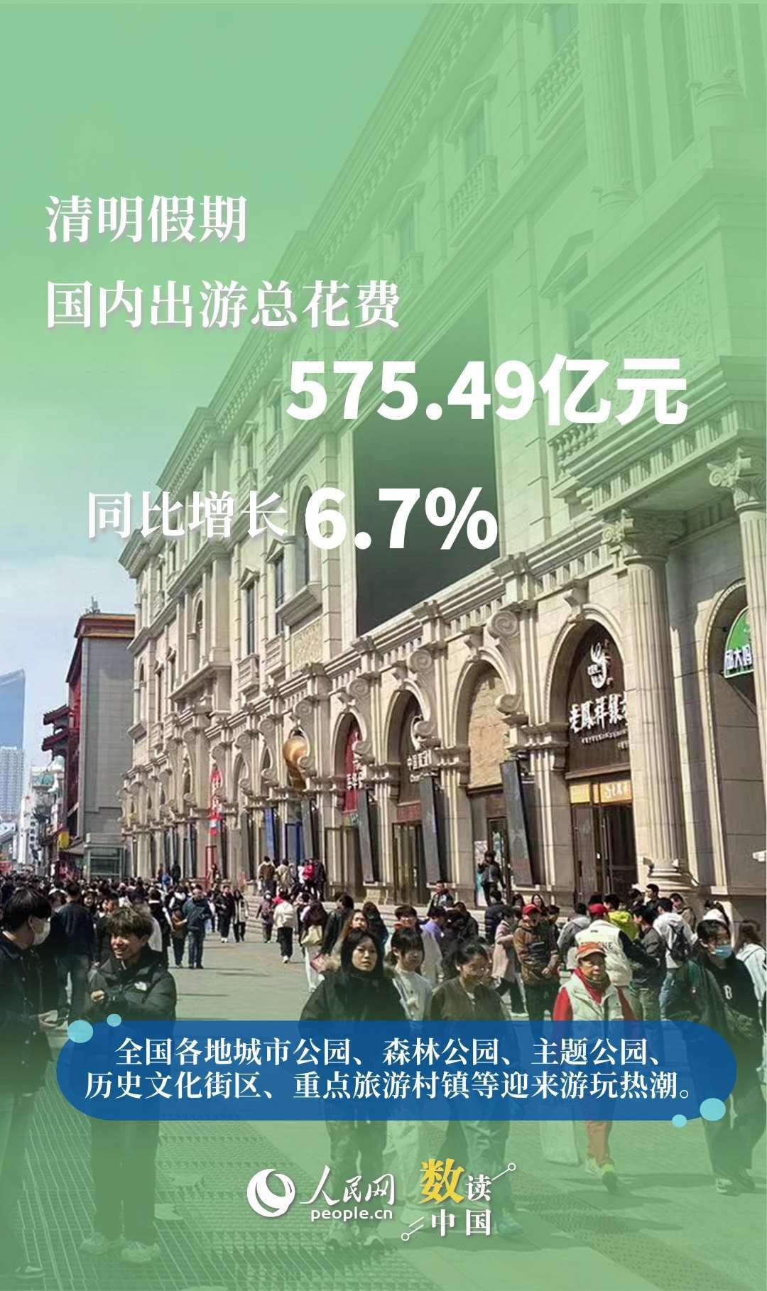 經(jīng)文化和旅游部數(shù)據(jù)中心測算,清明節(jié)假期3天,國內(nèi)出游總花費(fèi)575.49億元,同比增長6.7%。