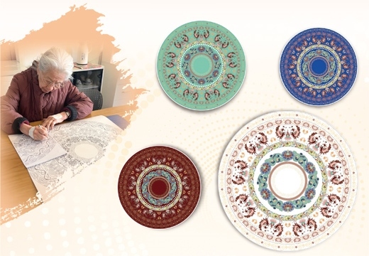 這個展項由94歲的著名工藝美術(shù)家常沙娜領(lǐng)銜創(chuàng)作,影像由中影(北京)電影制片廠有限公司制作。影像以4幅敦煌紋樣圖開篇?!耙还仓谱髁她堷P兩個版本,每一版都包含石青、石綠、紅、白4個顏色。敦煌寶相花、蓮花、龍鳳等元素均取自我臨摹的敦煌紋樣,都是象征吉祥、繁榮的紋樣。”常沙娜介紹,“鳳鳥取自五代428窟,寓意吉祥的祝愿;牡丹纏枝紋,代表繁榮、吉祥之意;石榴卷草紋,傳達了吉祥和豐富美好的寓意;雙龍吐珠紋樣也寓意吉祥喜慶;龍鳳紋樣圖案組合成和諧的圓盤,有龍鳳呈祥之意。”