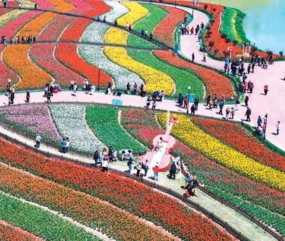 游客在江蘇省鹽城市大豐區(qū)荷蘭花海景區(qū)賞花游玩。