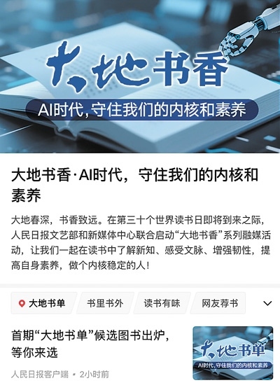 習(xí)近平總書記在今年全國兩會(huì)期間的重要講話中指出“書香是一種氛圍”“數(shù)字閱讀要和傳統(tǒng)閱讀結(jié)合起來,守住我們的內(nèi)核和素養(yǎng)”。在第三十個(gè)世界讀書日即將到來之際,人民日?qǐng)?bào)社文藝部和新媒體中心聯(lián)合啟動(dòng)“大地書香”系列融媒活動(dòng),并圍繞“AI時(shí)代,守住我們的內(nèi)核和素養(yǎng)”推出首期“大地書單”。來自出版、文藝、科技、教育等不同領(lǐng)域的20位薦書人,推薦出35本候選圖書,在人民日?qǐng)?bào)客戶端“大地書香”專題予以集中呈現(xiàn),參照網(wǎng)友的評(píng)論與推薦,最終推選出10本上榜圖書。讓我們多讀書、讀好書,一起在氤氳著書香的大地上行穩(wěn)致遠(yuǎn)。