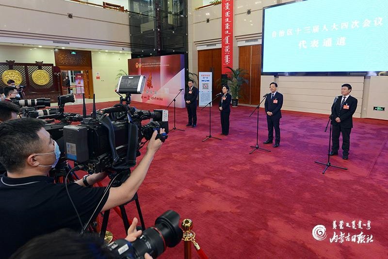 1月27日晚,自治區(qū)十三屆人大四次會(huì)議“代表通道”集中采訪活動(dòng)在內(nèi)蒙古人民會(huì)堂玻璃廳舉行,8位人大代表分兩組“亮相”。這是自治區(qū)人大首次開(kāi)通“代表通道”。圖為人大代表陳功明、劉淑華、唐毅和龔明珠4位代表(從左至右)回答記者提問(wèn)。內(nèi)蒙古日?qǐng)?bào)記者 金泉 攝