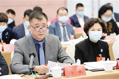 1月26日下午,呼和浩特市代表團審議政府工作報告時,梁永代表就加強教育事業(yè)發(fā)展提出建議。記者 袁永紅 攝