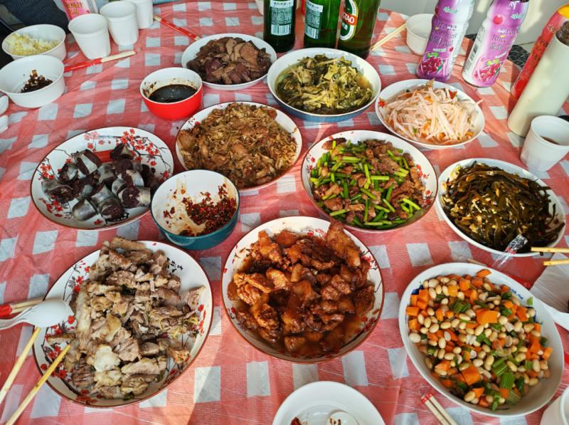 忙活了一上午,紅白相間的桌布上各類菜品早已擺得滿滿當當,除了位居主位的殺豬菜,還多了許多“衍生作品”:醬燜肉、汆白肉、蒜苔炒肉、酸菜炒肉、涼拌豬肝、豬血腸、涼拌海帶條、芥菜絲……圍坐一圈的不止家人,還有左鄰右舍。無需主人過多招呼,筷子便紛紛探向鍋中。窗外寒風(fēng)漸歇,霧氣也被陽光驅(qū)散,而在溫暖的屋子里,鍋氣蒸騰,模糊了窗上的冰花,也潤濕了每一雙帶著笑意的眼睛。這不僅僅是一頓飯,更是鄉(xiāng)里鄉(xiāng)親們對生活最熱烈的擁抱。