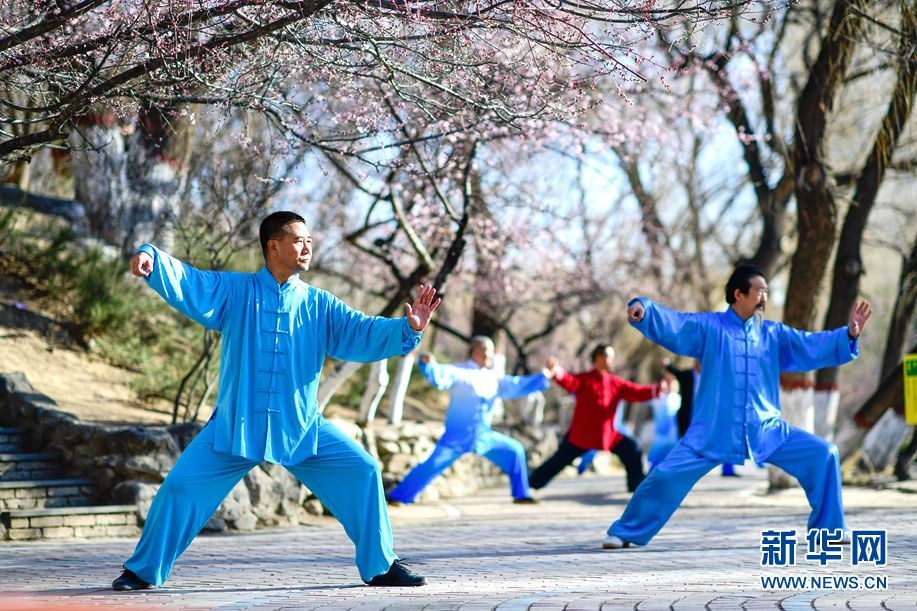 4月3日,健身愛好者在呼和浩特市滿都海公園的桃花樹下練太極拳。新華網(wǎng) 發(fā)(王正 攝)