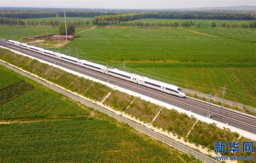 一列“和諧號”動車組列車行駛在內(nèi)蒙古赤峰市元寶山區(qū)的田野間(6月30日攝,無人機照片)。 當(dāng)日,隨著G8382次“和諧號”動車組列車從內(nèi)蒙古赤峰站緩緩駛出,喀左至赤峰高鐵全線開通運營。該線經(jīng)喀左站與京沈高鐵接軌,內(nèi)蒙古赤峰地區(qū)由此接入全國高鐵網(wǎng)。 新華社記者 彭源 攝 -