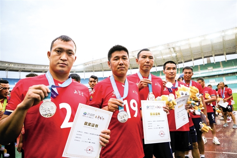7月26日,內(nèi)蒙古隊球員展示銀牌。當(dāng)日,第十四屆全國運動會群眾比賽足球項目十一人制男子農(nóng)村鄉(xiāng)鎮(zhèn)組決賽在大雨中開戰(zhàn)。最終經(jīng)過90分鐘的爭奪,代表內(nèi)蒙古出戰(zhàn)的錫尼河鎮(zhèn)隊與陜西隊?wèi)?zhàn)成1:1平,在隨后進(jìn)行的點球大戰(zhàn)中,內(nèi)蒙古隊2:4不敵對手,獲得該項目的亞軍。(攝影/北方新報正北方網(wǎng)記者 牛天甲)